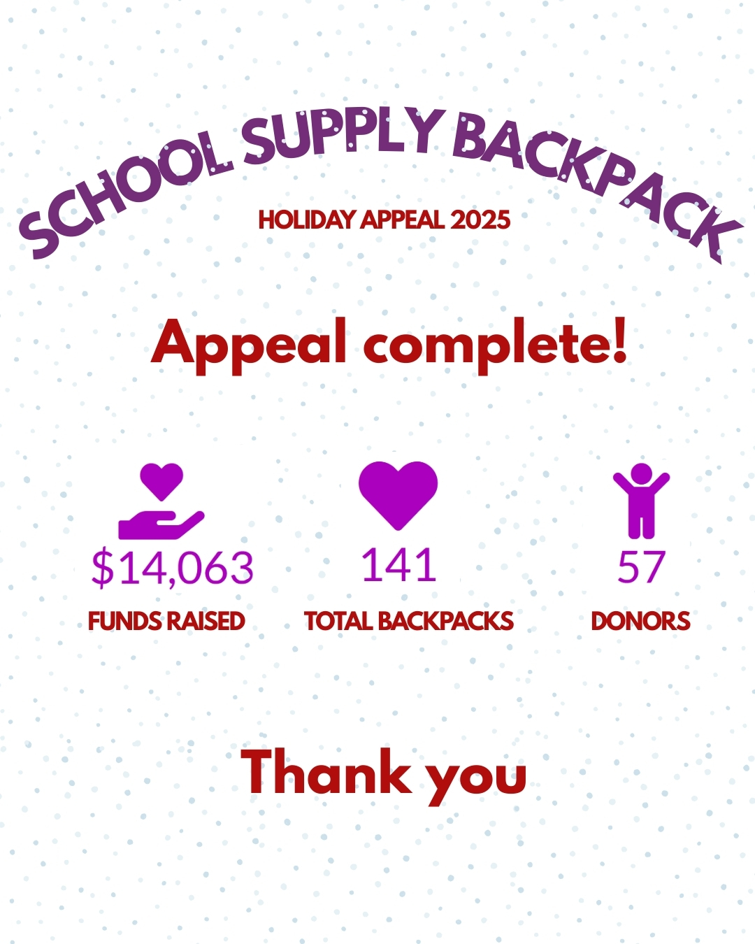 Our 2025 School Supply Backpacks Appeal is now complete, and we are overwhelmed by the generosity of our donors. A huge thank you to the kind 57 donors who supported this drive to provide children in need with the tools they need to succeed.